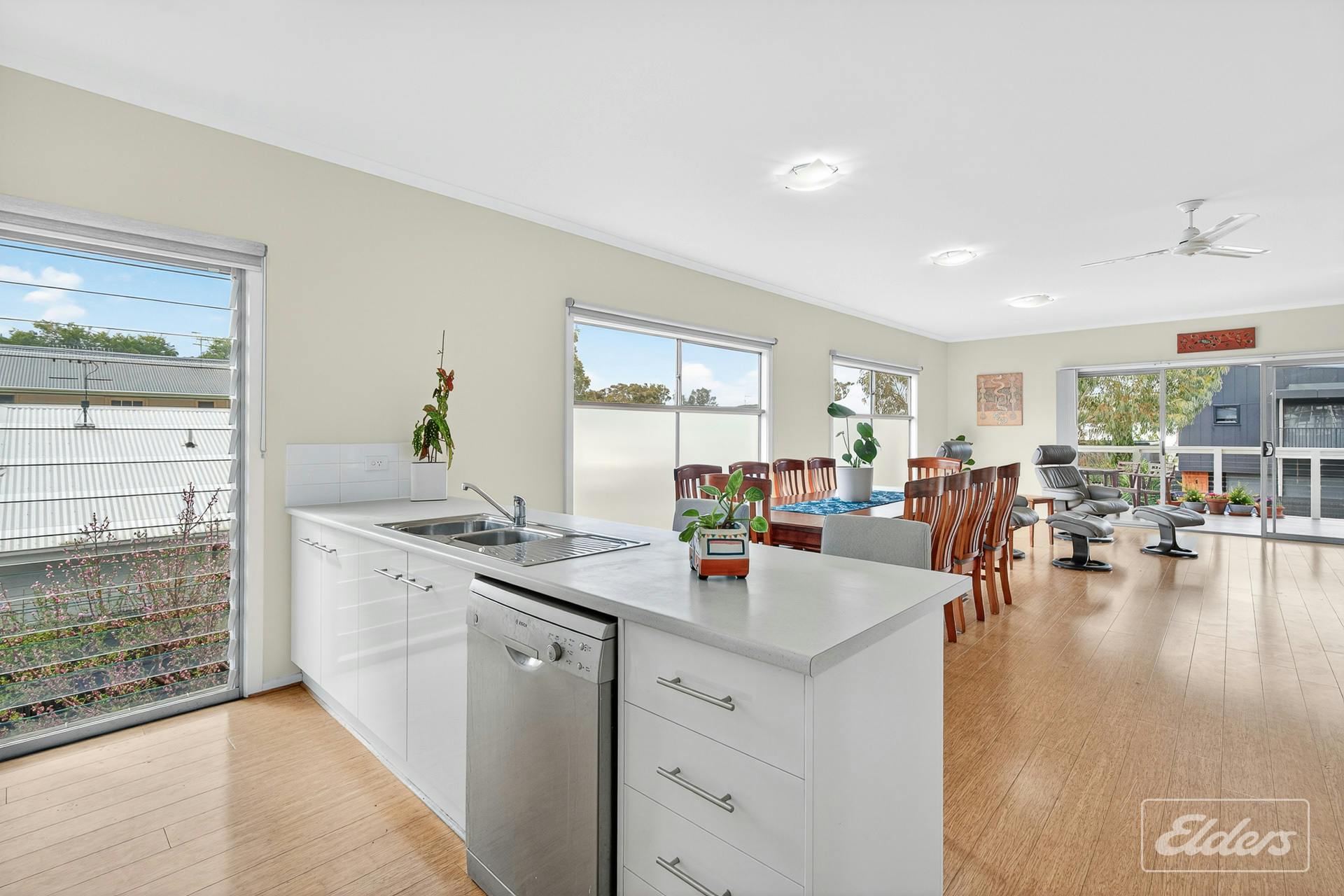 Step inside to discover light-filled interiors where soaring ceilings, timber floors and full-length windows capture sunshine and coastal breezes. The expansive open-plan living, dining and kitchen zone on the upper level flows seamlessly onto a wide, covered balcony – the ideal place for morning coffees, sunset drinks, or hosting friends while overlooking the leafy streetscape. The well-equipped kitchen features modern appliances, generous bench space, and a handy walk-in pantry.